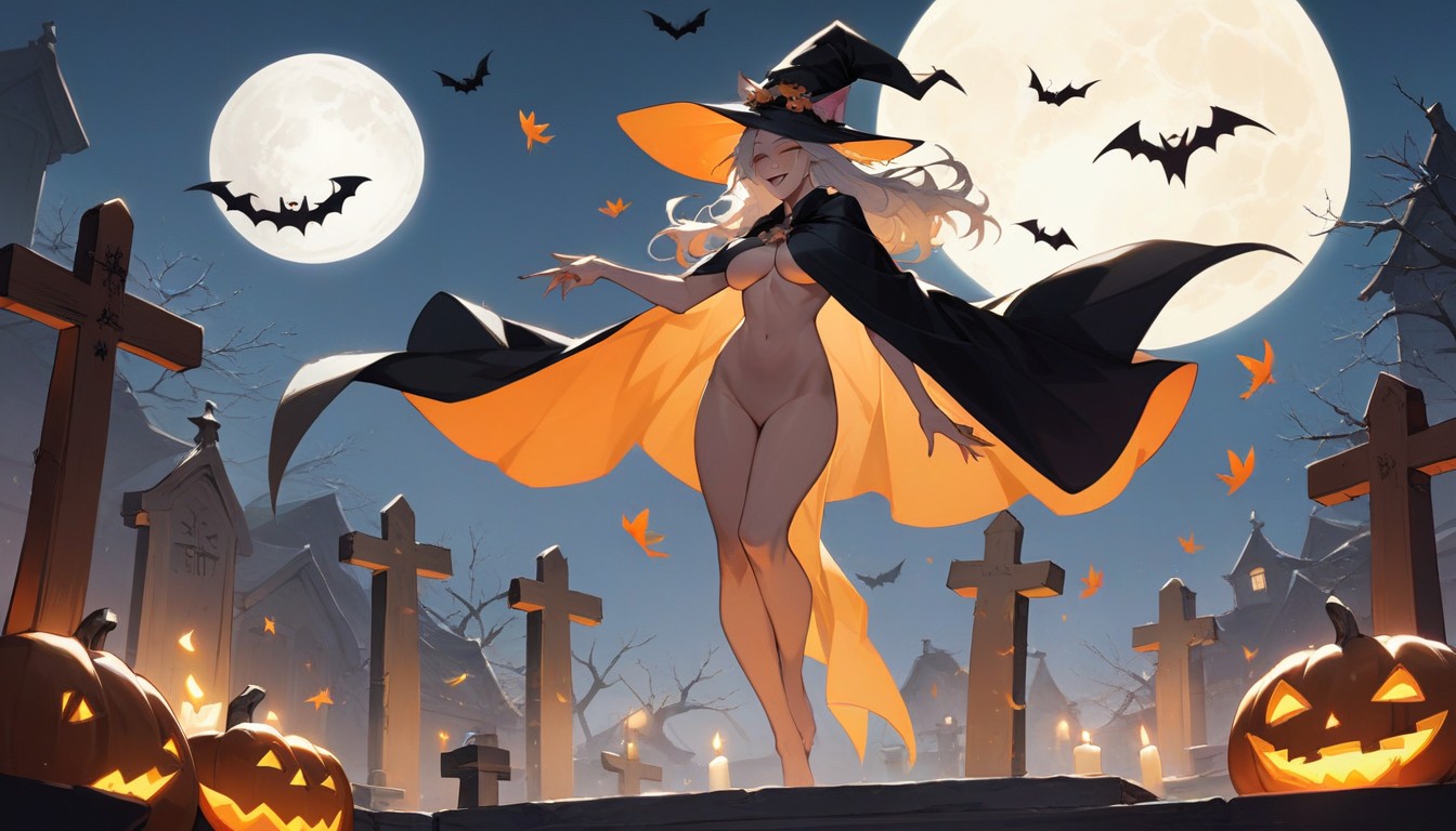 Halloween, Witch, Many Naked Witches Dancing Under A Full Moon In A Graveyard With Cats Furry AI Porn