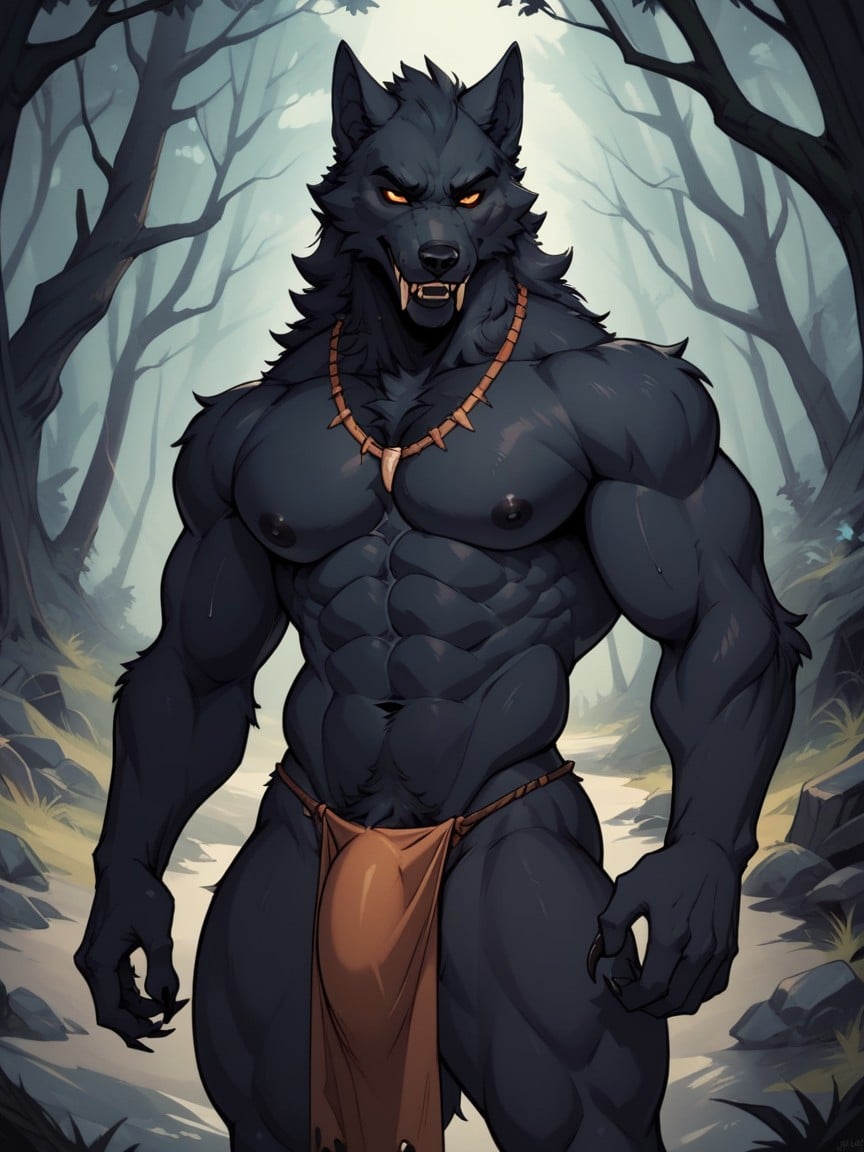 Night Time Forest, Loincloth, Huge Big Black Werewolf Furry AI Porn