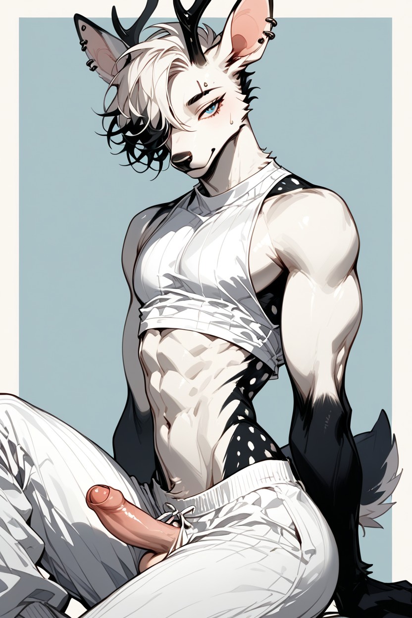deer, gay, gay, gay, anthro, furry, white fur, white body, white hair with black highlights, wavy hair, long fringe over one eye, big ears, ear piercings, ю, white balls, baggy sweatpants, (white sweatpants down :1.1), white crop top, sleeveless crop top, arched back, sitting, leaning back on arms, looking at viewer, wasp waist, lean body, wide hips, detailed, no nipples, solo, pink penis, foreskin, fit, biceps, white butt, tail